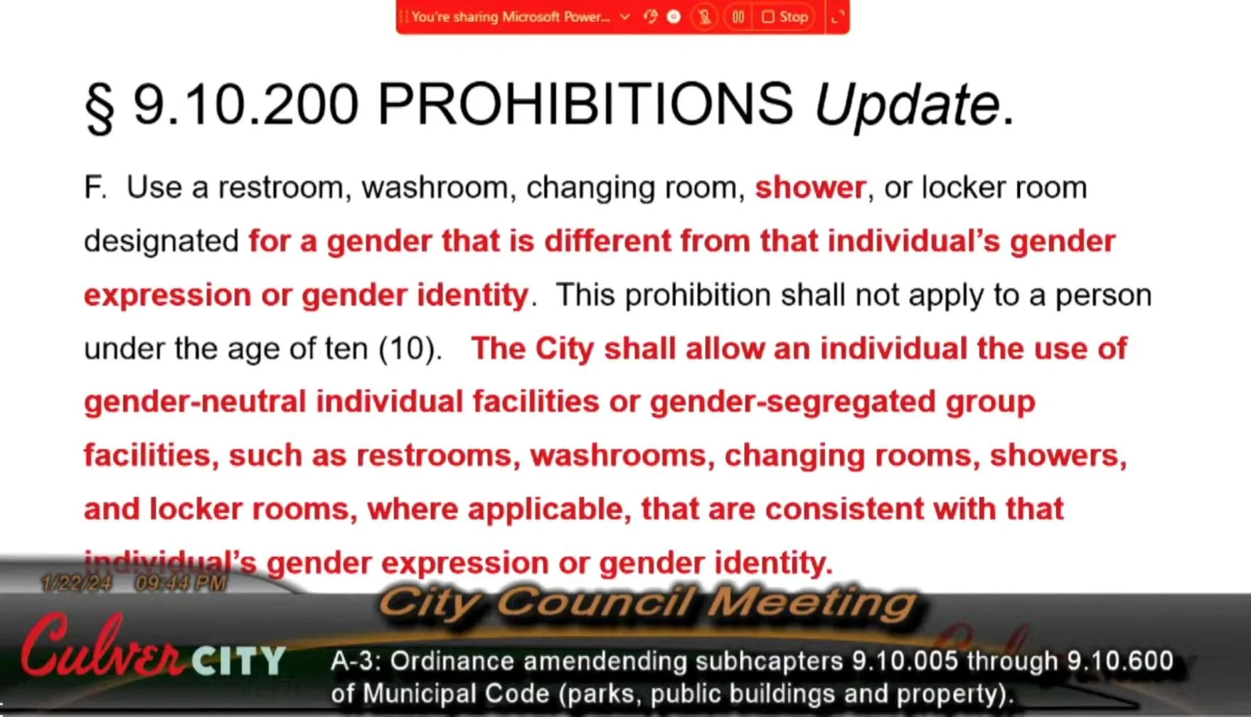 Culver City has long had a prohibition on anyone over 10 years old using a public restroom “designated for the opposite sex.” This is precisely the language that is used to target trans people in bathroom bills that are being passed in red states like Florida.